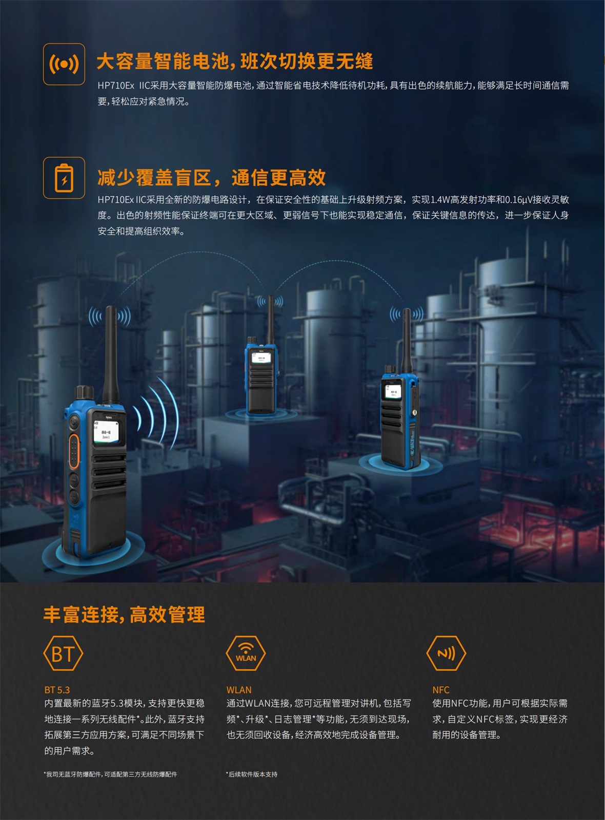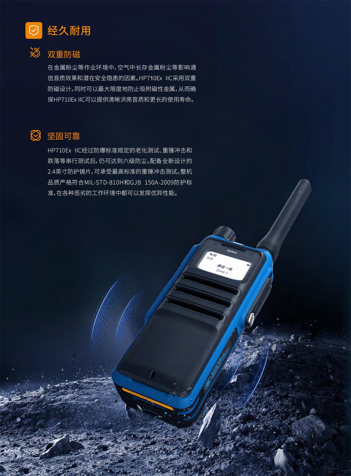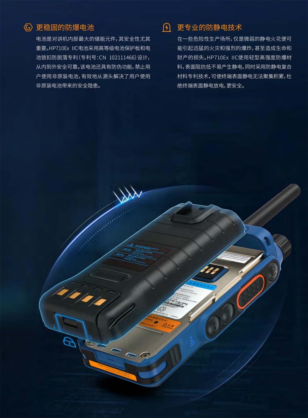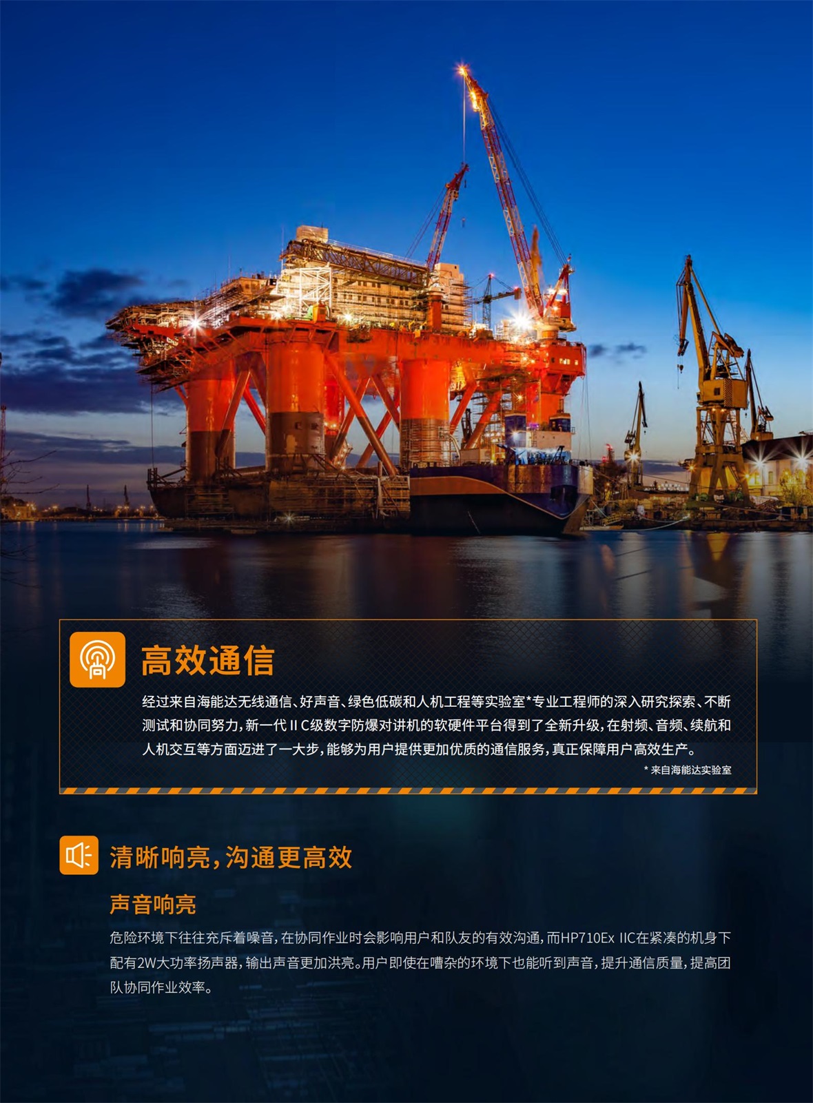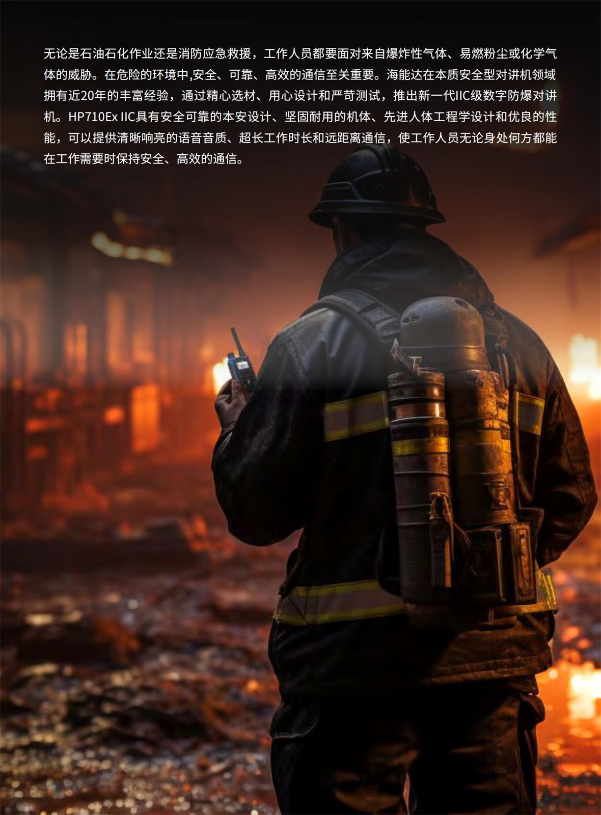 无论是石油石化作业还是消防应急救援,工作人员都要面对来自爆炸性气体、易燃粉尘或化学气体的威胁。在危险的环境中,安全、可靠、高效的通信至关重要。海能达在本质安全型对讲机领域拥有近20年的丰富经验,通过精心选材、用心设计和严苛测试,推出新⼀代IIC级数字防爆对讲机。HP710Ex IIC具有安全可靠的本安设计、坚固耐用的机体、先进⼈体工程学设计和优良的性能,可以提供清晰响亮的语音音质、超长工作时长和远距离通信,使工作人员无论身处何方都能在工作需要时保持安全、高效的通信。