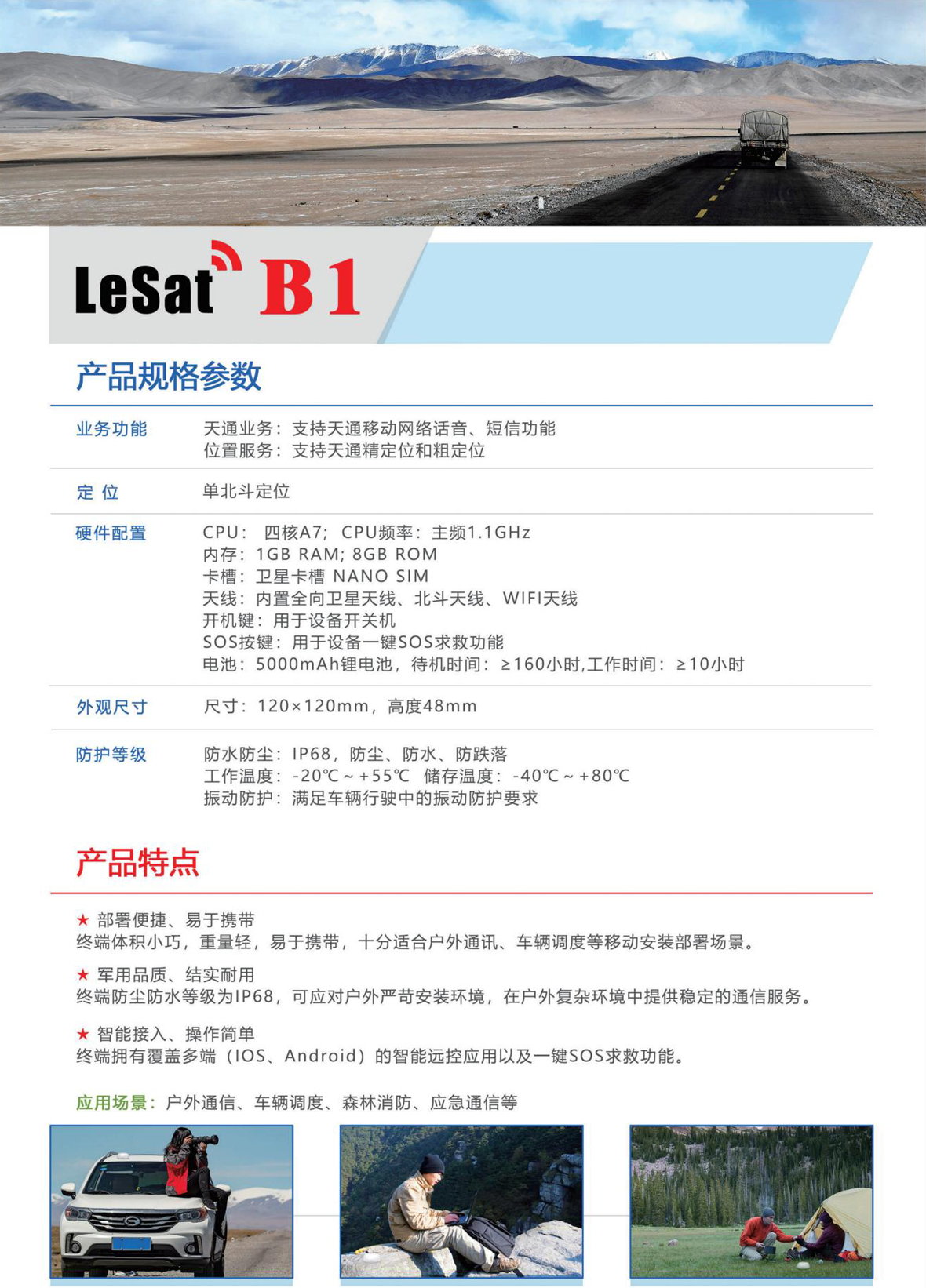 ü 支持中国自主研发的“天通一号”卫星移动通信系统 ü 使用中国电科54所全自主研发的“天通一号”卫星基带和射频芯片,技术成熟,国内领先,保密性强 ü 支持北斗+GPS双模定位功能,实现实时定位及位置跟踪 ü 常规状态下,终端平均搜星入网时间快于90秒 ü IP68防护等级,可防侵水一米30分钟、防灰尘侵入 ü 支持低温-30°工作,可以适合多温度区域环境 ü 支持大容量电池,入网状态下待机时长不低于160小时,通话时长不低于10小时 ü 一键SOS紧急求救功能,可向指定号码拨打卫星电话,并发送位置信息 ü 整机小巧,方便携带 ü 支持多用户共享卫星网络资源(8个设备接入),远控APP支持IOS\Android手机下载 ü Wifi热点覆盖范围不低于30米(无遮挡) ü 采用高通4核处理器,系统运行更稳定、流畅 |