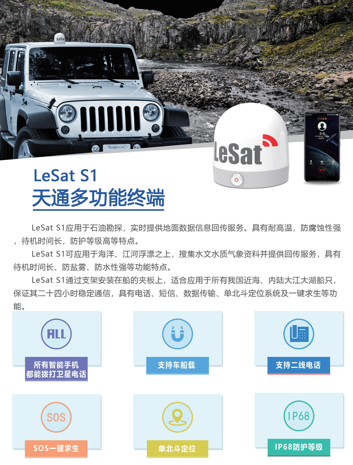 适合应用于所有我国近海、内陆大江大湖船只,保证其二十四小时稳定通信,具有电话、短信、数据传输、双定位系统及一键求生等功能