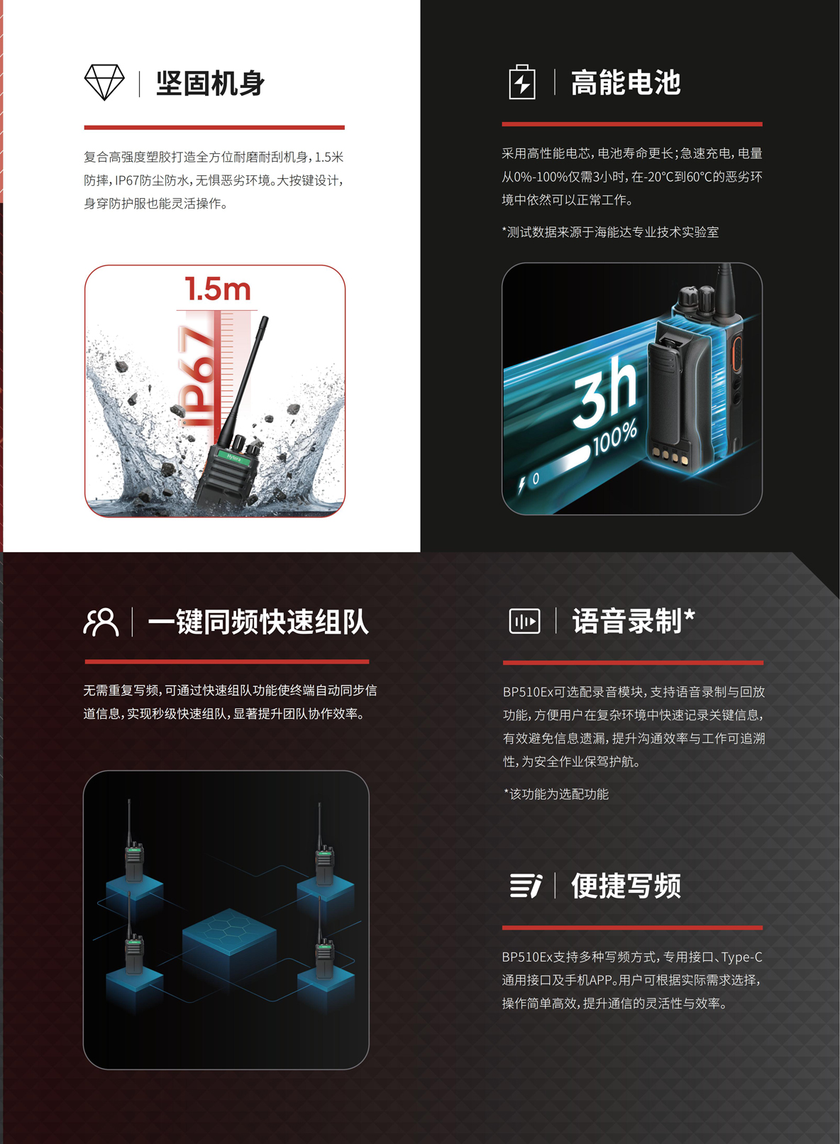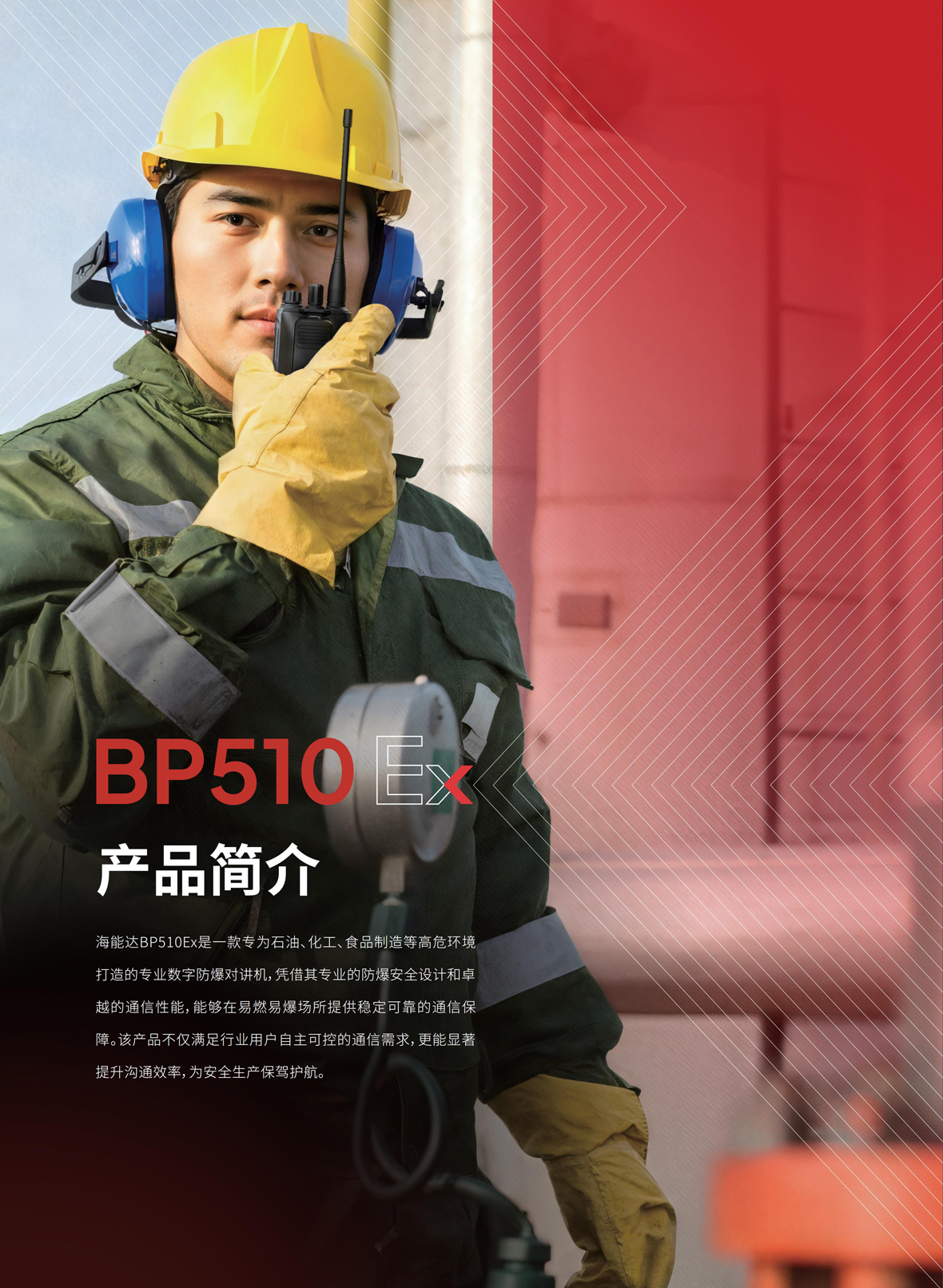 BP510防爆是海能达严格按照中国最新防爆电气标准GB3836(2021版)开发,基于“本质安全性”设计的一款IIB等级防爆对讲机,为石油化工等含有爆炸性、可然性的气体粉尘等高危业务环境提供专业的安全通信保证。HP500拥有高性能,大功率喇叭+AI智能消噪带来的洪亮清晰语音、高容量电池带来的更长工作续航、超高灵敏度以及高标准的抗干扰性能带来的更大通信范围和更可靠的通信保障。Type-C接口进行写频、升级等,同时也可在非防爆区域通过Type-C接口进行充电,大大提升了对讲机管理和使用的便利性。