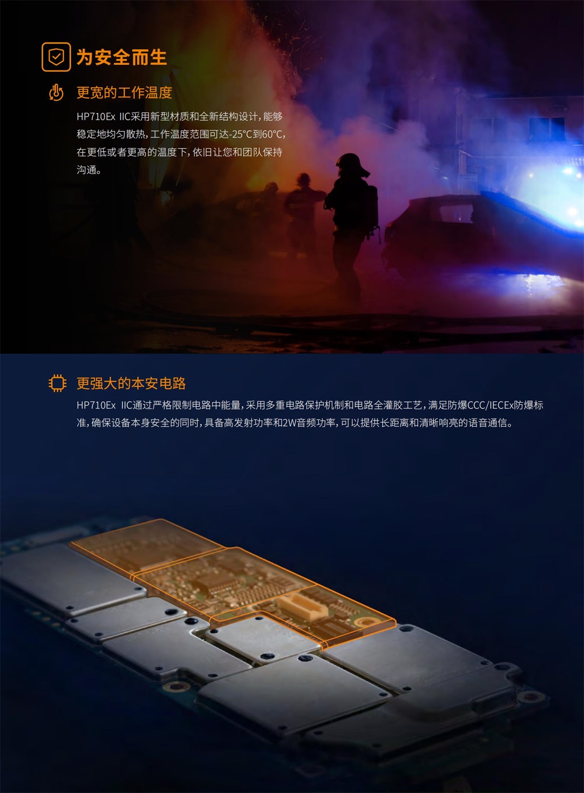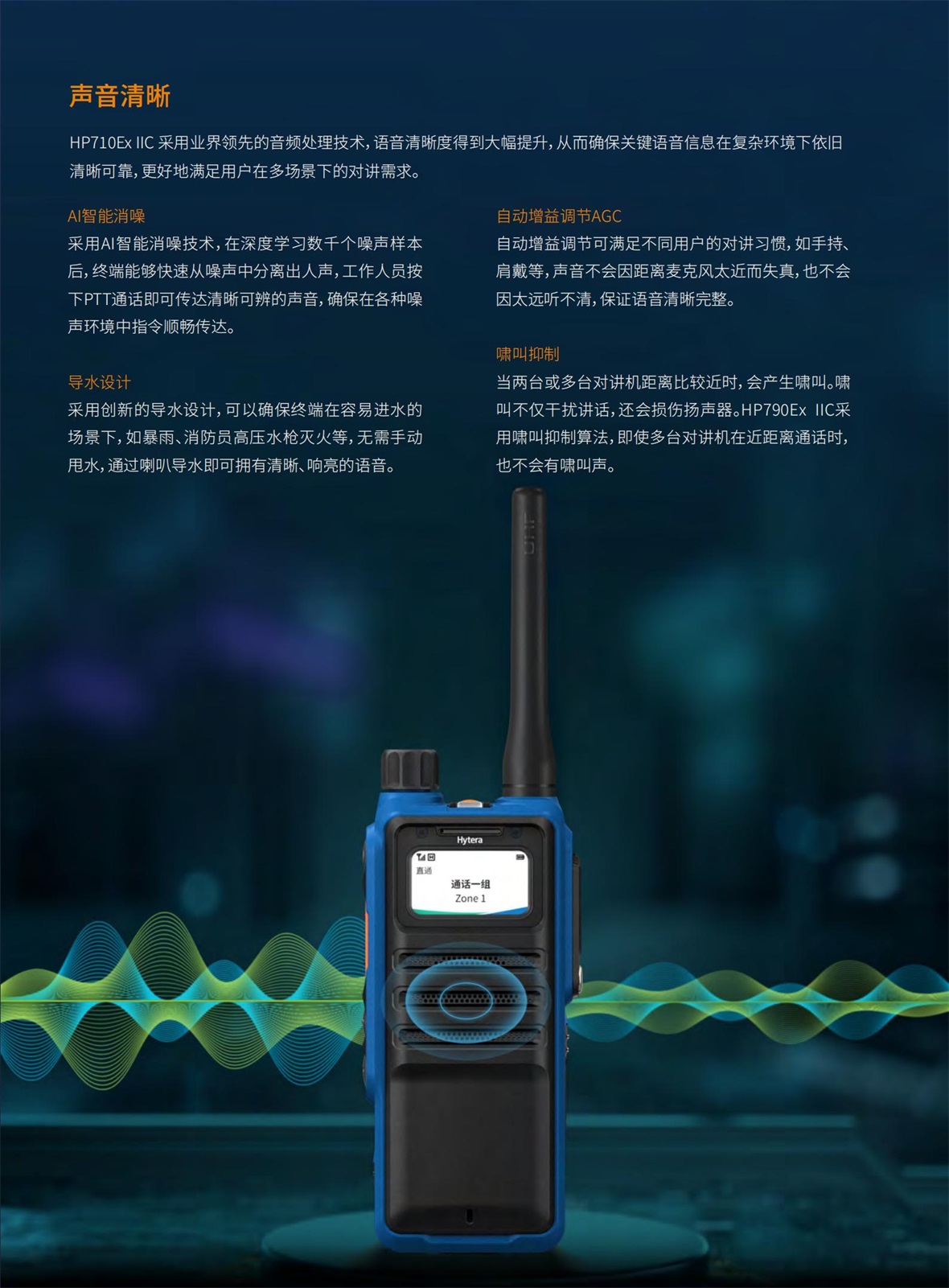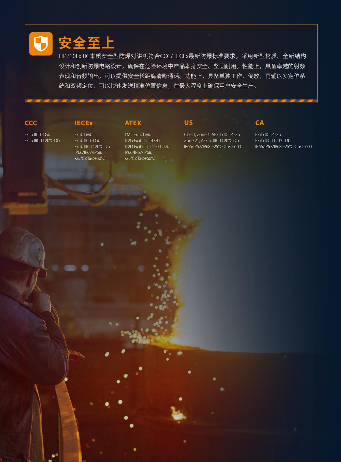 无论是石油石化作业还是消防应急救援,工作人员都要面对来自爆炸性气体、易燃粉尘或化学气体的威胁。在危险的环境中,安全、可靠、高效的通信至关重要。海能达在本质安全型对讲机领域拥有近20年的丰富经验,通过精心选材、用心设计和严苛测试,推出新⼀代IIC级数字防爆对讲机。HP710Ex IIC具有安全可靠的本安设计、坚固耐用的机体、先进⼈体工程学设计和优良的性能,可以提供清晰响亮的语音音质、超长工作时长和远距离通信,使工作人员无论身处何方都能在工作需要时保持安全、高效的通信。