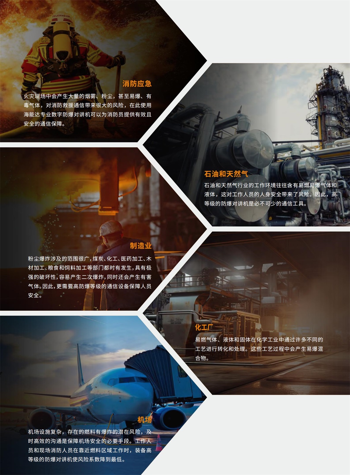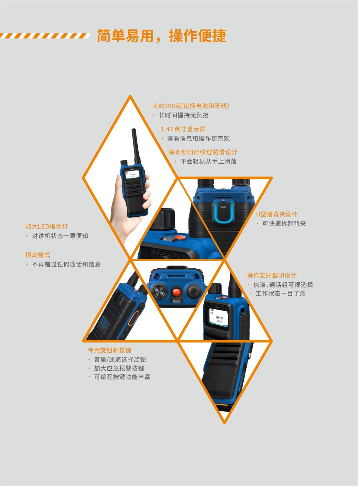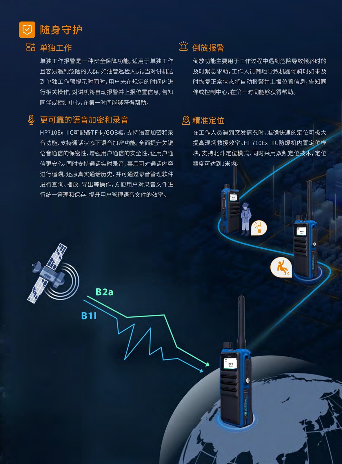 无论是石油石化作业还是消防应急救援,工作人员都要面对来自爆炸性气体、易燃粉尘或化学气体的威胁。在危险的环境中,安全、可靠、高效的通信至关重要。海能达在本质安全型对讲机领域拥有近20年的丰富经验,通过精心选材、用心设计和严苛测试,推出新⼀代IIC级数字防爆对讲机。HP710Ex IIC具有安全可靠的本安设计、坚固耐用的机体、先进⼈体工程学设计和优良的性能,可以提供清晰响亮的语音音质、超长工作时长和远距离通信,使工作人员无论身处何方都能在工作需要时保持安全、高效的通信。